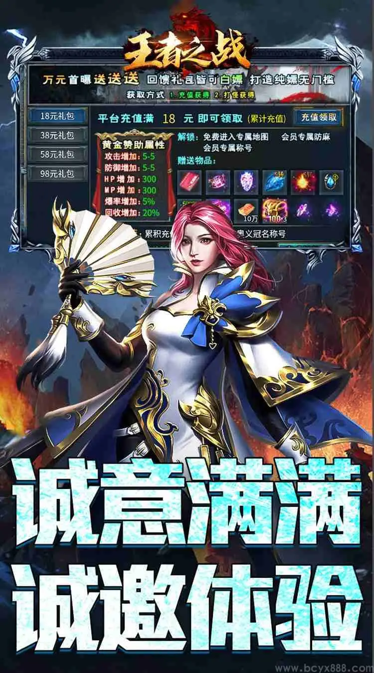 《王者之战-正版单职业》是一款沙城争霸单职业,游戏中的所有BOSS爆率全开,小怪都能爆终装、充值卡,装备靠打最爽快!装备回收:BOOS爆装备可回收成钻石,享受边玩边赚钱,富甲一方不是梦!!神装合成,游戏爆得装备可合成神装,突破属性极限更轻松!