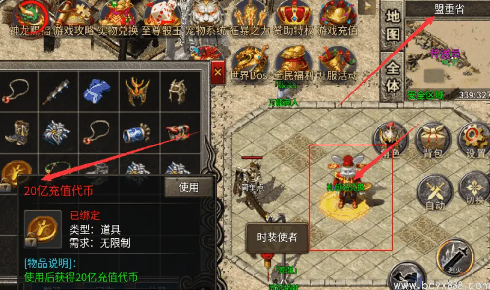 兑换方式:第一大陆(盟重省)NPC:礼包码兑换